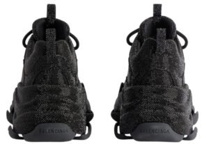 The Balenciaga Triple S Rhinestones Black is not for the faint of heart. Its silhouette remains true to its lineage: exaggerated, oversized, and layered like architectural strata. The shoe’s name—Triple S—derives from the three stacked soles borrowed from running, basketball, and track sneakers, fused together into a Frankensteinian hybrid. What began as a critique of sneaker culture’s obsession with performance and function has now evolved into a fully crystallized aesthetic statement.