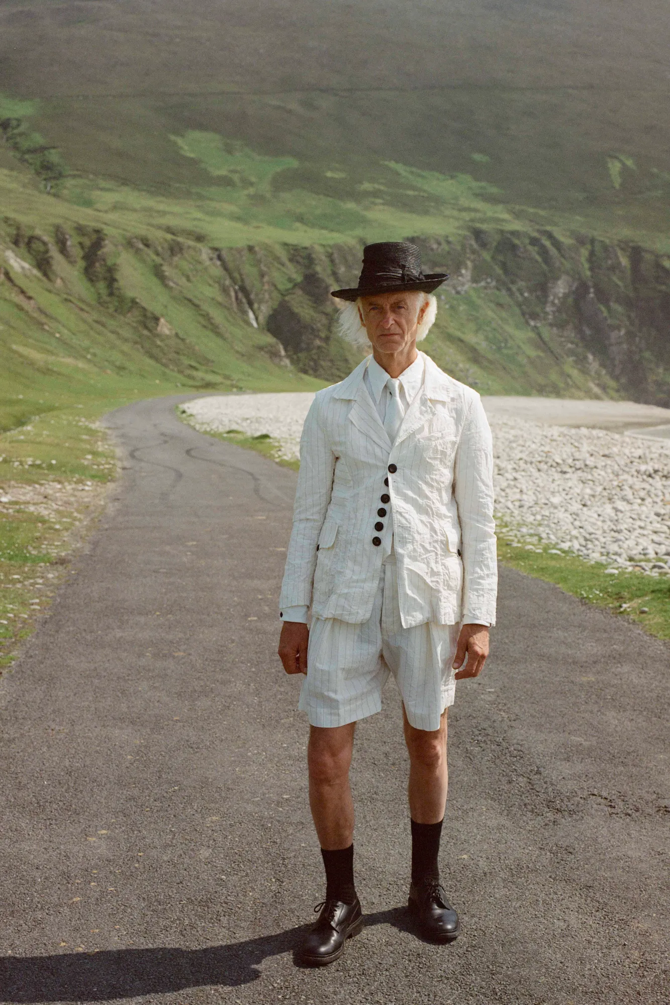 Rather than hiring models or planning an editorialized shoot, Skelton took to the streets and hills to street-cast local men—farmers, musicians, publicans, and fishermen, most of whom had never modeled before. This decision resonates deeply within his wider practice. Since his early collections, Skelton has rejected fashion’s obsession with polished sameness in favor of authenticity and individuality. His models are never mannequins but characters—conduits for the garment’s soul.