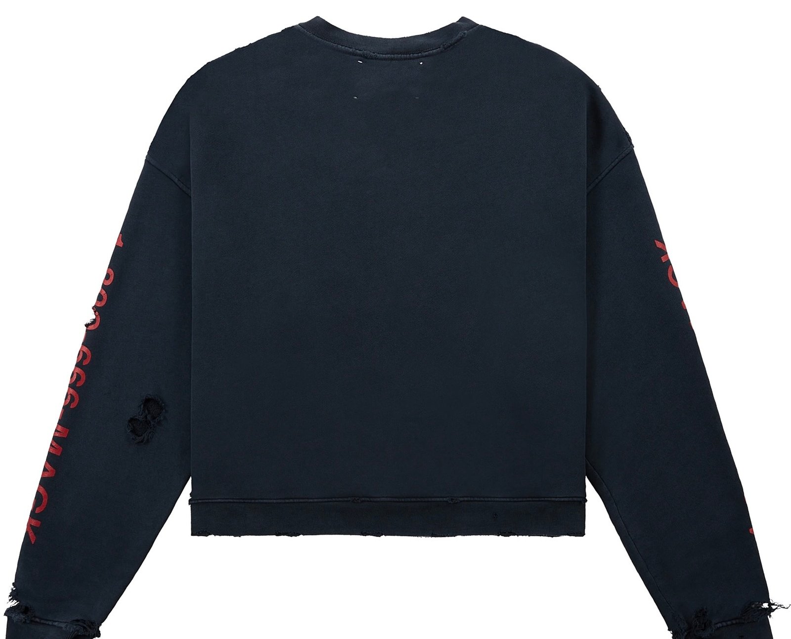 The body is cut in a boxy, cropped silhouette, which further distances the piece from standard athletic sweatshirts. Instead, the proportions suggest customization—almost as if someone took scissors to a thrifted crewneck to impose their own will. This detail underscores the brand’s ethos: the wearer is not just buying a garment, but a rebellion against conventionality.