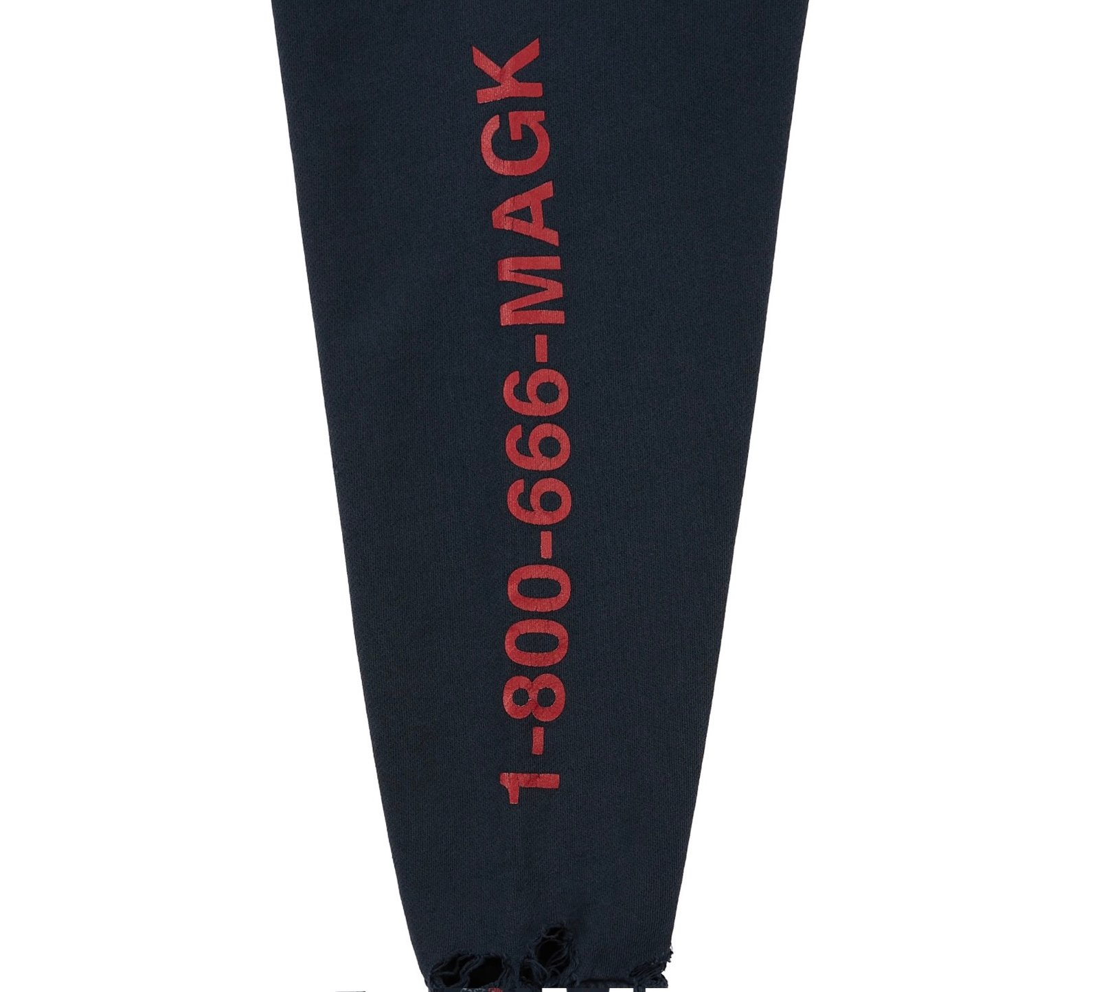 Perhaps the most arresting detail is the sleeve print: in bold red block letters, the numbers read “1-800-666-MAGI.” This phone-number-styled phrase fuses kitsch with menace. It evokes old-school telemarketing hotlines, now reframed as a satanic parody of customer service. It is humor edged with provocation, situating the sweatshirt firmly within the realm of counterculture.
