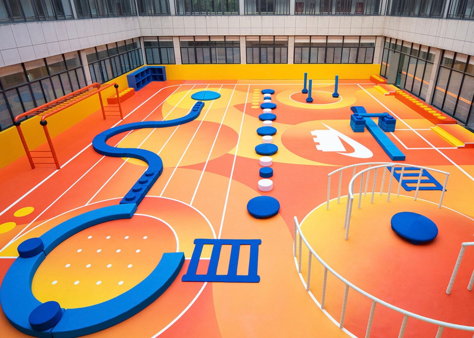 Nike’s athletic influence is evident in the way surfaces transition between running lanes, balance paths, and climbing zones. The height variations and textural changes subtly mirror sports training modules—encouraging agility and coordination without ever feeling like exercise. Everything remains rooted in fun.