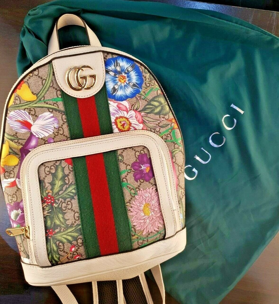 The leather trim is another detail that enhances the luxurious feel of this backpack. Its smooth texture provides a tactile contrast to the more rugged GG canvas, while the white tone complements the floral print, creating a harmonious palette. Gucci’s use of gold-tone hardware—from the double G logo to the zippers and buckles—adds a final touch of opulence. These subtle details are what set a luxury item like this backpack apart from fast-fashion counterparts. Every element is carefully considered, right down to the stitching, which demonstrates Gucci’s commitment to quality craftsmanship.