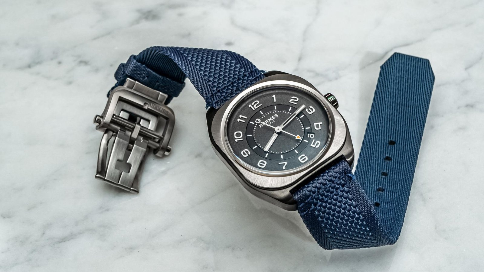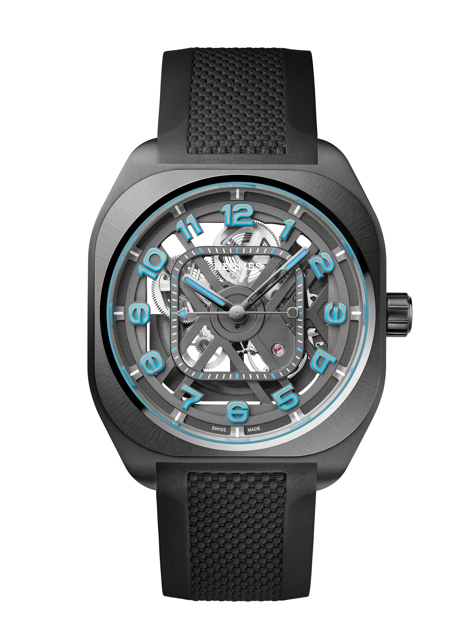 The strap underscores this philosophy. Rendered in rubber with a fabric-like texture, it bridges the tactile expectations of Hermès craftsmanship with the functional demands of a contemporary sport watch. It references heritage without replicating it. It translates rather than repeats.