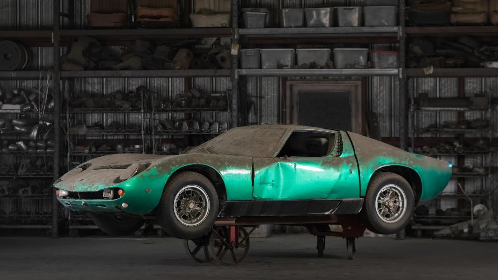 The most significant of the three is a 1968 Miura P400, finished in aqua green, and believed to have been owned by Lamborghini engineer and test driver Claudio Zampolli. This car has been estimated to sell for between $500,000 and $700,000, depending on the extent of restoration it undergoes. It’s one of only 275 such examples produced by Lamborghini and features bodywork designed by Bertone, adding to its historical and aesthetic value. However, it bears a sizable dent in the driver’s side door, a reminder of its time spent in obscurity.