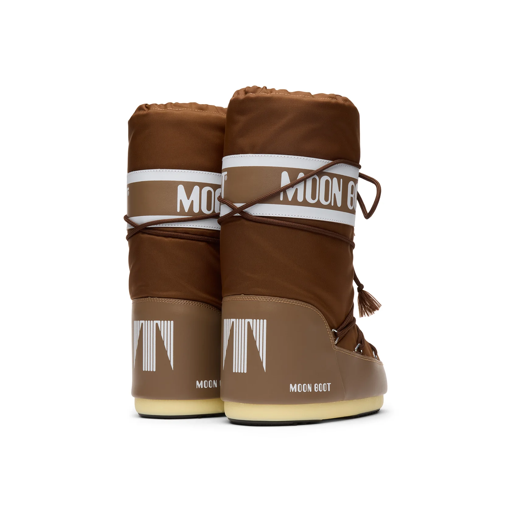 The cocoa-brown exterior shown across the images makes this colorway unusually refined. Earth tones often flatten footwear designs, but here the tone softens the boot’s futurism, giving it a more grounded, sartorial warmth. The white “MOON BOOT” branding across the mid-band provides crisp contrast, reminding the wearer—and the onlooker—that this is a boot with storied heritage.
