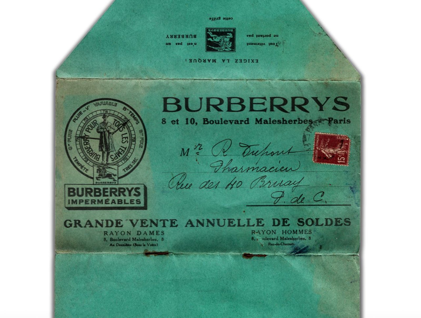Long before digital newsletters and algorithmically targeted promotions, Burberrys—as it was then known—was already a master of functional elegance and inventive communication. A remarkable artifact from the early 1920s offers proof: a fold-out sale catalogue announcing the Grande Vente, or big sale, designed to double as its own mailing envelope. This ephemera, over 100 years old, doesn’t just reveal a clever piece of marketing—it illustrates an early 20th-century ethos of design rooted in purpose, refinement, and direct engagement with the client.