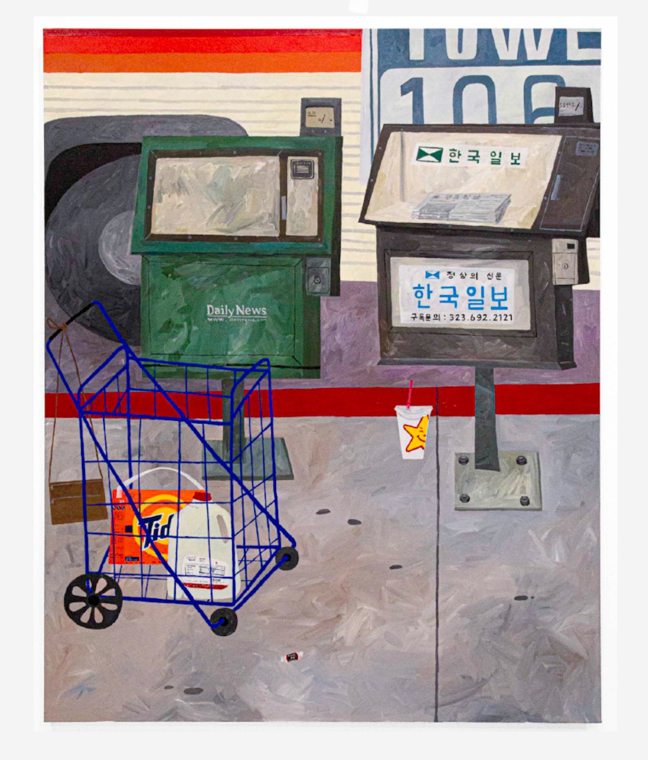 Landscapes of Los Angeles in dominant narratives are glossy—sun-bleached hills, iconic palisades, cinematic boulevards. But Los Angeles doesn’t begin and end at the Hollywood sign. Park’s canvas interrogates the ambience of strip malls, DIY markets, storefronts painted in Korean and Spanish, city blocks alive with the rhythms of working families. She names zones other narratives render invisible.