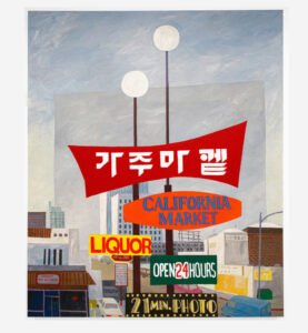 LA is a visual language. Park asks us to read its signage as we would script. In Corner Store (한식 반찬), Korean characters glow in a window display, a mix of cold case delights: kimchi, japchae, tteok. The sign is lit in pink neon. Park captures the aluminum door frame, the bent flyer stuck beneath the door, the mismatched vinyl floor tiles inside. It’s as if she’s handed us a phrase in Hangul and asked us to translate it through pigments: what it means to belong, to nourish community, to carve out daily life in a foreign place.