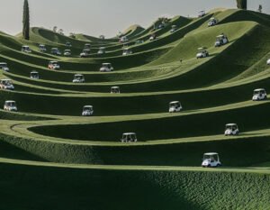 In a digital expanse where form, motion, and illusion converge, Ulises Studio presents Curious Conformity—a surreal meditation on repetition, systematized behavior, and the unsettling comfort of uniformity. Through a sequence of looping images and videos, identical white golf carts coast across vibrantly green fields, driverless and perfectly synchronized. Their trajectories trace invisible patterns across a hyperreal lawn, a silent yet potent choreography that blurs the line between aesthetic harmony and philosophical disquiet.