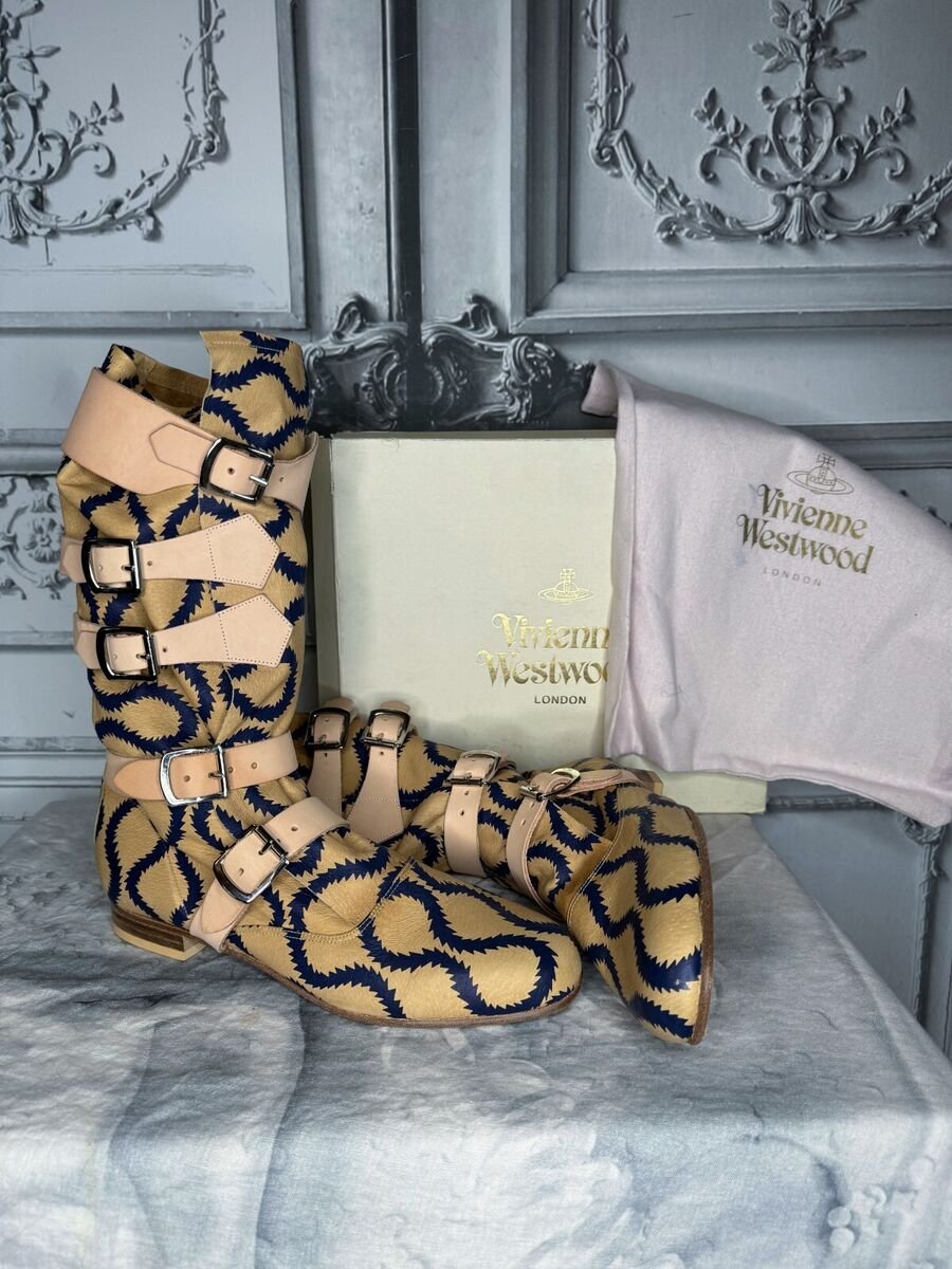 The squiggle pattern, composed of repetitive curvilinear forms in tan and white, lends the boots an almost cartoonish aesthetic. Yet, it is precisely this exaggeration that transforms the boots into a wearable work of art. Crafted from high-quality leather with sturdy stitching and hand-painted detailing, the boots are not just a statement piece but also a testament to Westwood’s commitment to craftsmanship. Each pair is meticulously constructed, ensuring that the form does not compromise functionality—a crucial balance that many avant-garde designers struggle to achieve.