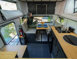 Jake and Milly, a couple from Washington, built theirs for alpine ski tours. “The diesel heater has changed our lives,” Jake says. “We’ll park at a trailhead at 9, sleep warm, and be on skis before dawn. This thing has seen more powder days than half the ski bums we know.”
