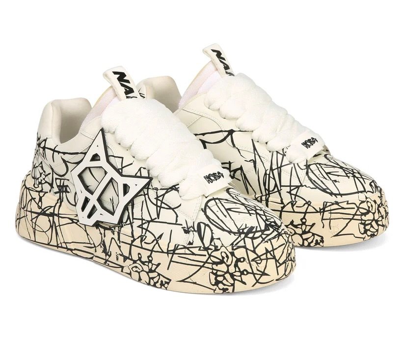 At first glance, the KOSA BLACK SCRIBBLE may read as a bold yet cryptic entry in the ongoing archive of luxury streetwear. A blacked-out platform sneaker covered in what seems to be erratic, white hand-drawn graphics, it evokes the raw graffiti of a bathroom stall in a nightclub, or the marginalia of a restless student’s notebook. But look closer, and a different picture emerges—one that places Naked Wolfe firmly in the lineage of brands like Rick Owens, Raf Simons, and Vetements, who view fashion not as ornament, but as language.