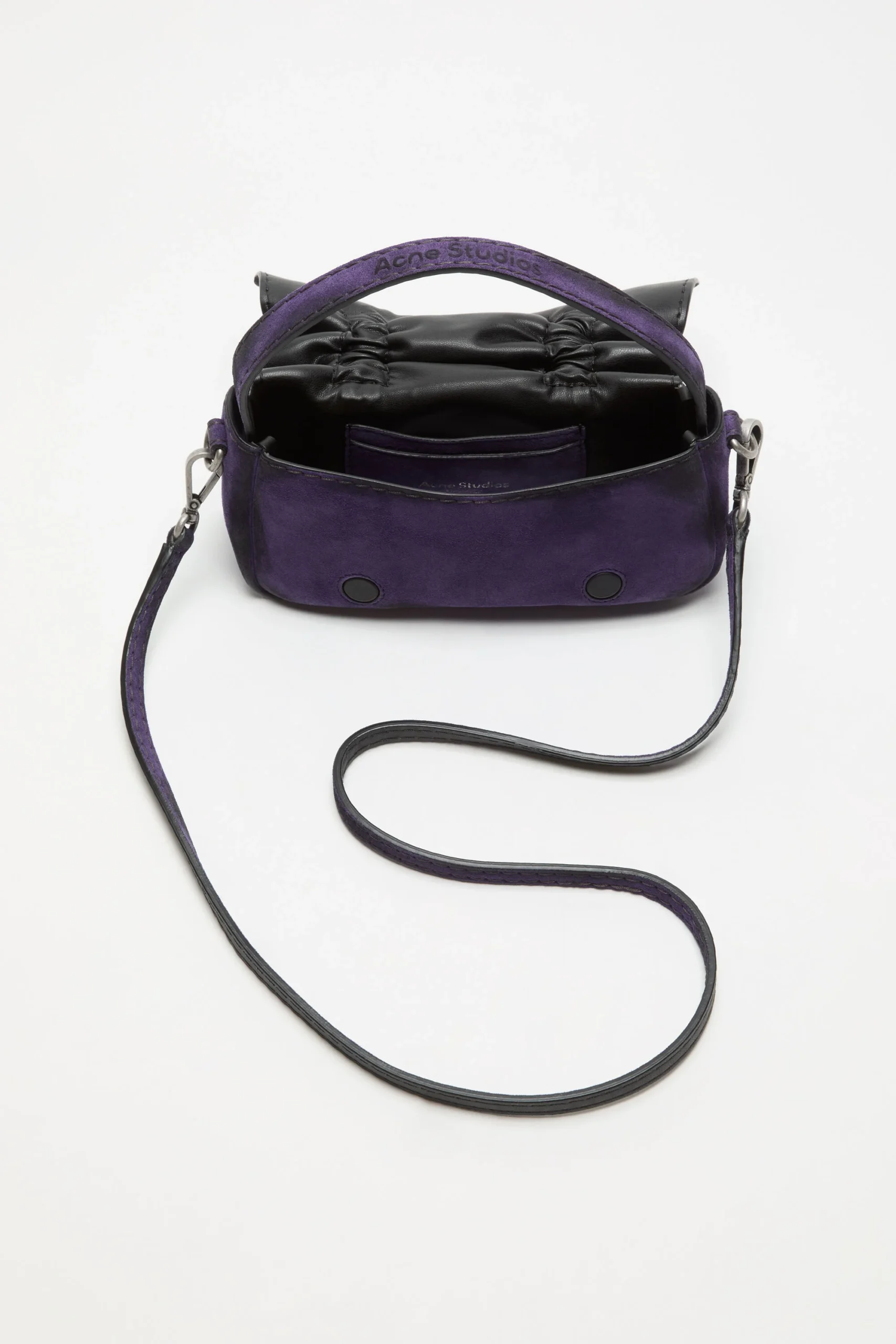 The Acne Studios Multipocket Micro Bag in violet purple is a study in precision. Every element—scale, color, structure, material—is calibrated to create a cohesive whole.