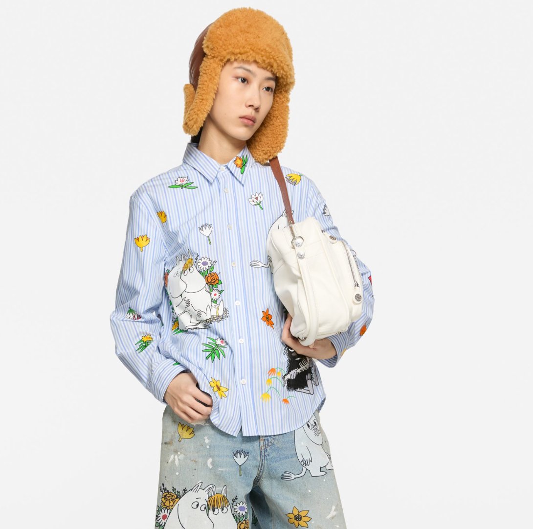 Striped shirting with contrast cuffs and hem taping showcase Acne’s talent for elevated basics, made idiosyncratic by the inclusion of Little My, who appears mid-stride in several all-over patterns.