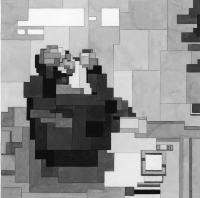 In this piece, Lister deconstructs the original album cover of “The Blueprint,” which features a monochromatic image of Jay-Z in a contemplative pose. Through his pixelated watercolor technique, Lister transforms the photograph into a geometric abstraction, maintaining the essence of the original while introducing a new visual language. The artwork invites viewers to engage with the familiar image in an unfamiliar form, prompting reflections on the intersection of art, music, and cultural memory.