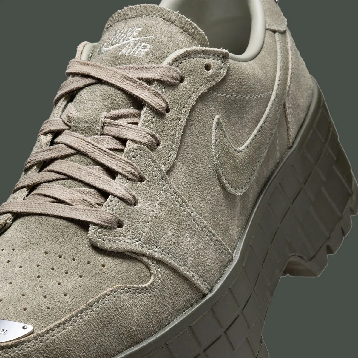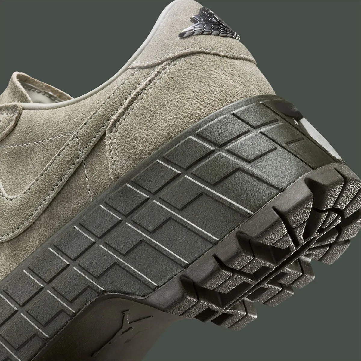 The “Cargo Khaki” execution—layered with “Spruce Fog”—doesn’t attempt to convert skeptics. It doesn’t brighten, exaggerate, or overcompensate. Instead, it leans further into what the Brooklyn already is: a reconfiguration of the Air Jordan 1 that prioritizes stance over speed, presence over performance.