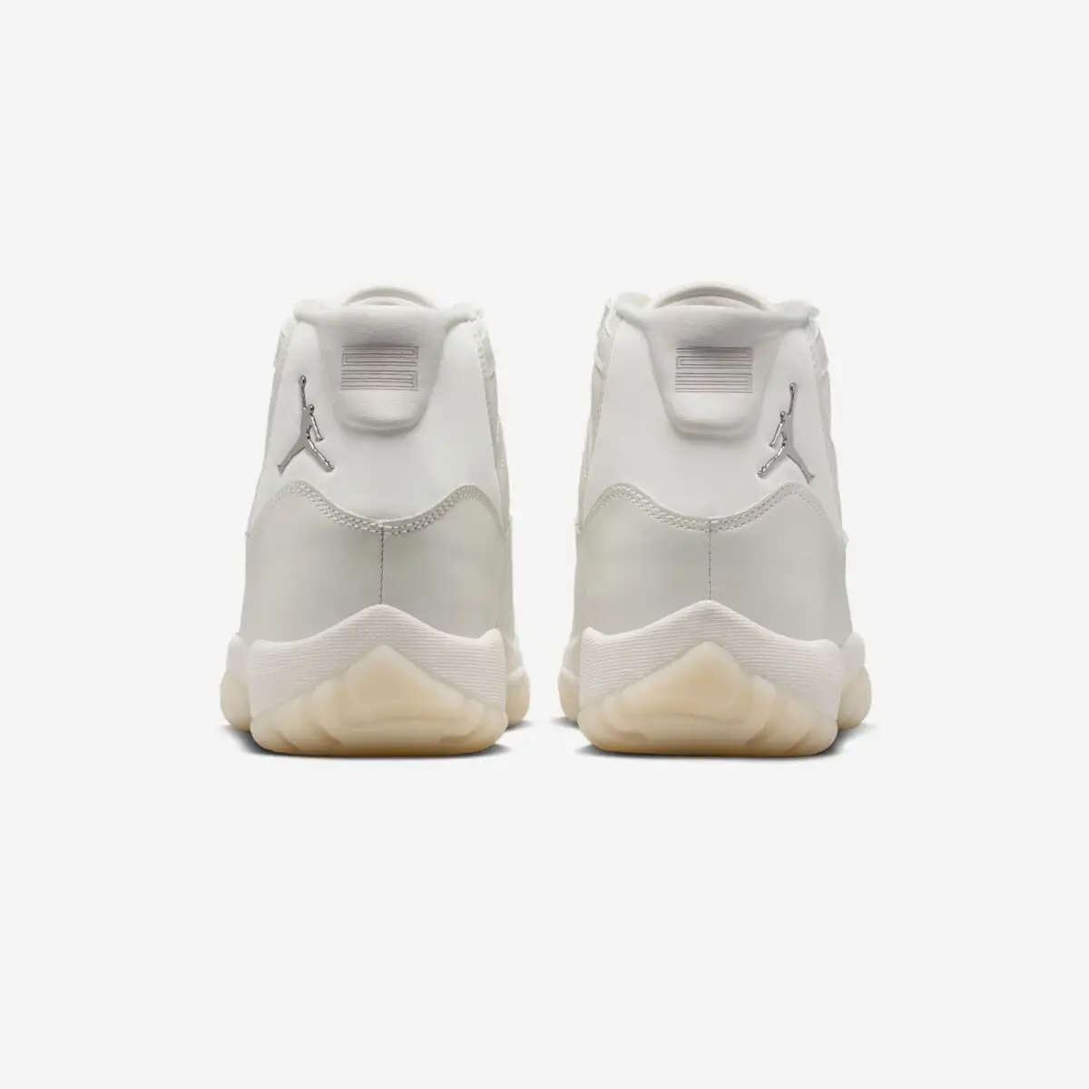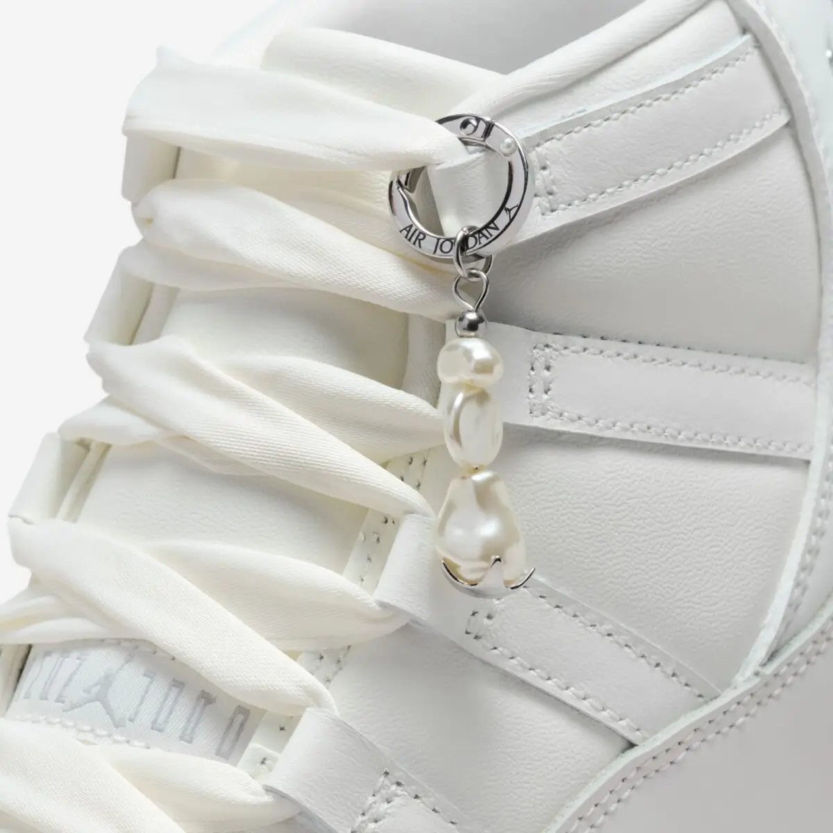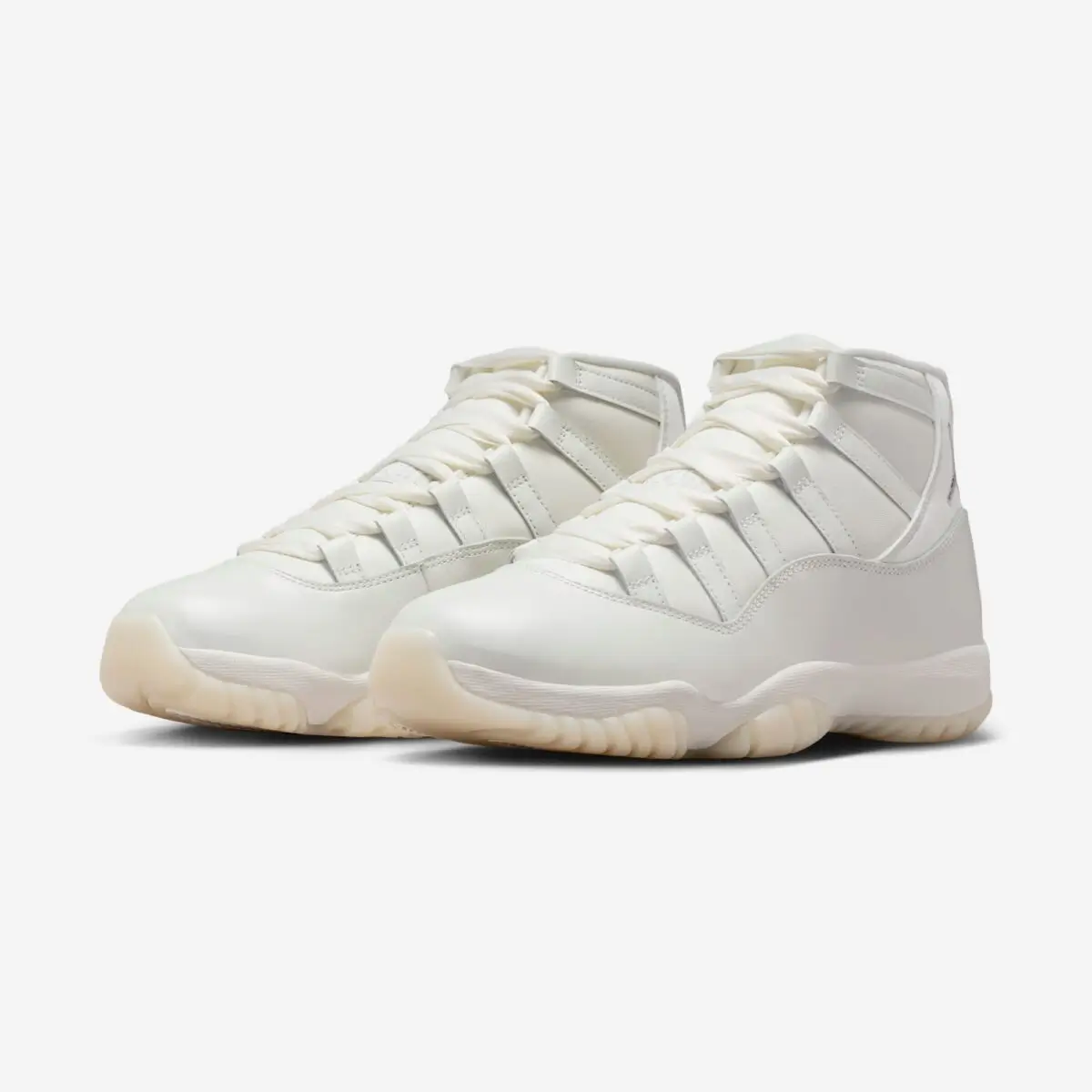 The patent leather mudguard—a signature element of the Jordan 11—becomes the centerpiece of the design. Instead of high-contrast black or bold metallics, it is coated in a sleek, pearl-infused sheen. The gloss reflects light with a jewelry-like finish, giving the shoe an almost couture appeal.