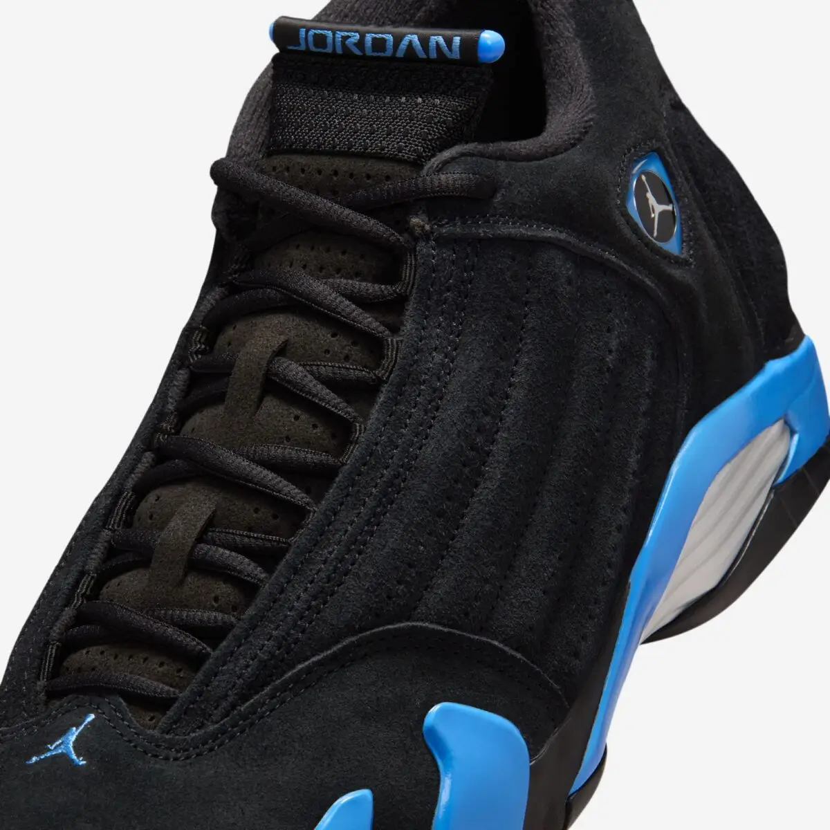 The upcoming Air Jordan 14 “University Blue” stays loyal to the original design language. The shoe features an all-black upper constructed from premium nubuck, creating a smooth and stealthy base. Against this dark backdrop, University Blue accents appear across key areas of the shoe, bringing a vibrant contrast that instantly catches the eye.