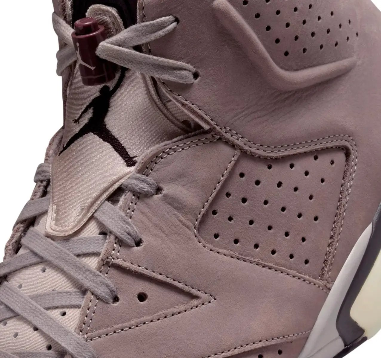 At first look, the “Smokey Mauve” colorway is a study in restraint. Rather than leaning into the aggressive, high-contrast palette typical of retros, A Ma Maniére chooses a muted spectrum built around dusty purple, washed taupe, and soft charcoal. The suede that wraps the upper is rich yet understated, a material choice that immediately signals the shift in intention. The Jordan 6, known for its sharp lines and athletic sculpting, becomes almost velvet-like in profile. Each panel feels considered, as though sanded down until only its essential shape remains. This is a sneaker that understands elegance as the product of reduction, not embellishment.
