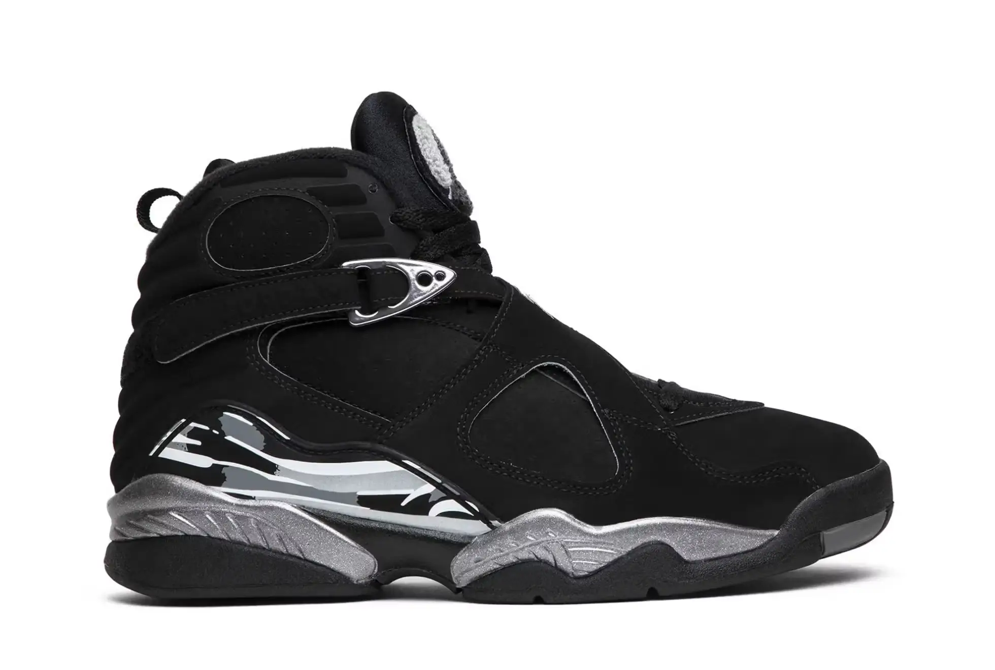 Among all the maximal silhouettes in Jordan history, few feel as wearable as the Air Jordan 8 “Chrome.” The model itself is unapologetically bold—cross-straps, sculpted panels, padded collar, heavyweight sole—but when it’s dressed in black and cool grey, the whole thing sharpens into something timeless.