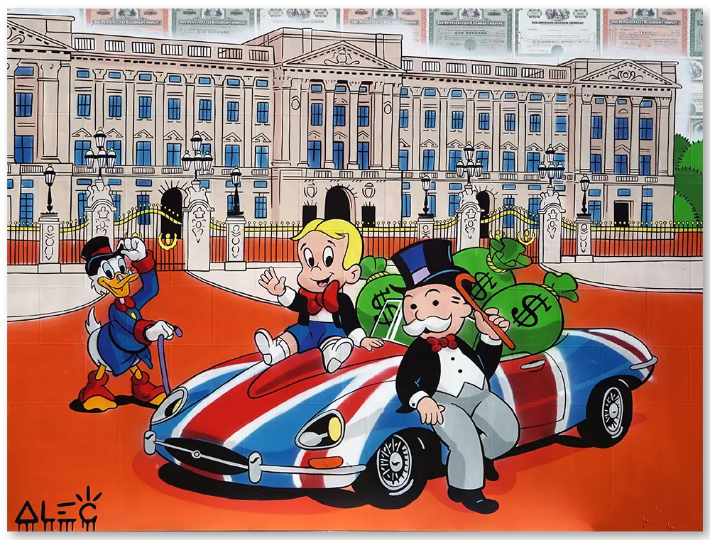 Alec Monopoly’s artistic language thrives on recognizable cultural icons. In this painting, those icons are assembled into a vivid stage scene. A wealthy duck figure, a young heir character, and the iconic Monopoly mascot occupy the foreground, celebrating atop a British flag–painted automobile while bags of cash bulge from the back seat. The palace’s ornate gates and stately architecture frame the scene like the set of a grand historical drama.