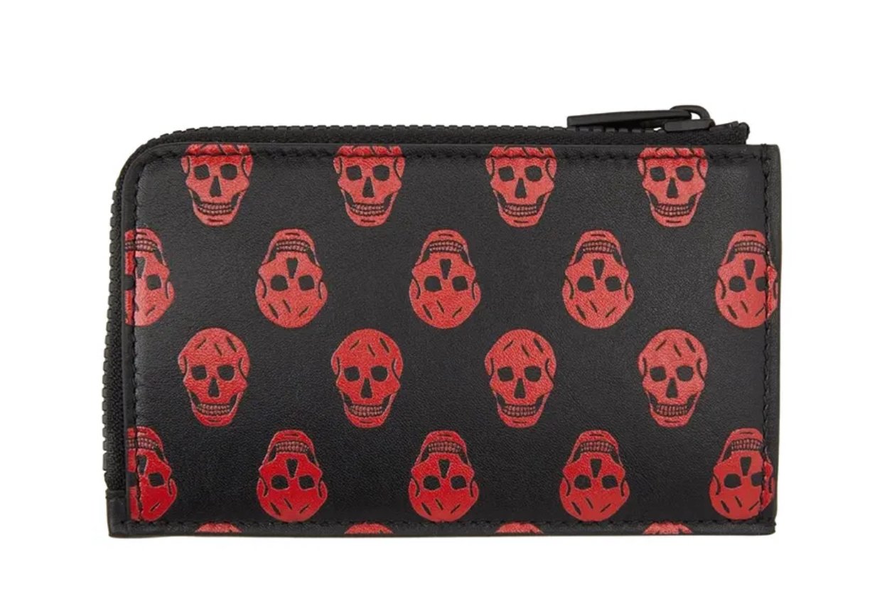 Crafted from premium black leather, the card holder features an all-over red skull motif, a signature element of Alexander McQueen’s design language. The juxtaposition of black and red hues creates a striking visual contrast, embodying the brand’s rebellious spirit. The zip-around closure not only adds a layer of security but also enhances the item’s sleek profile.