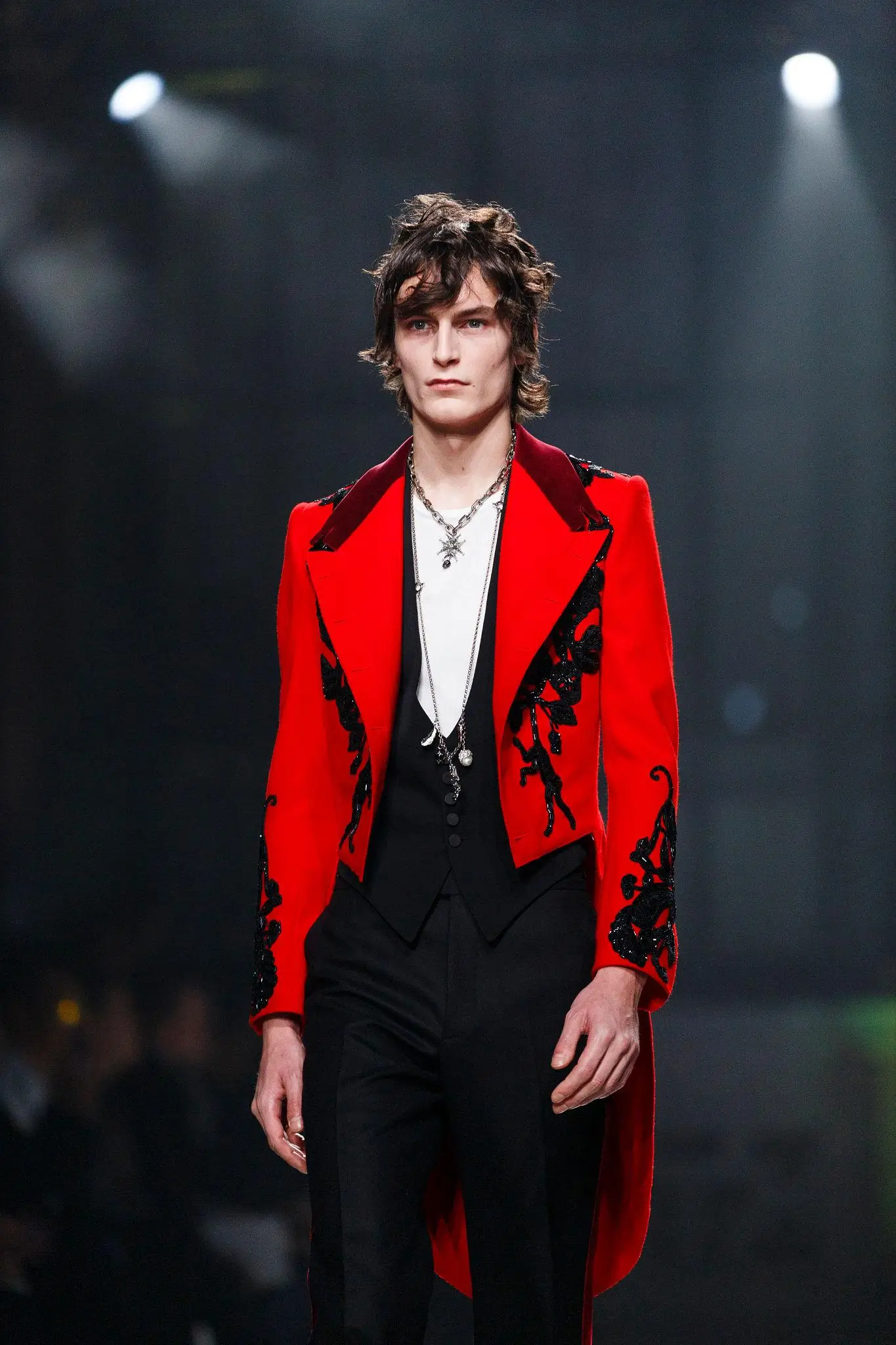 The house continues to reinterpret Savile Row craftsmanship through new materials, silhouettes, and cultural references.