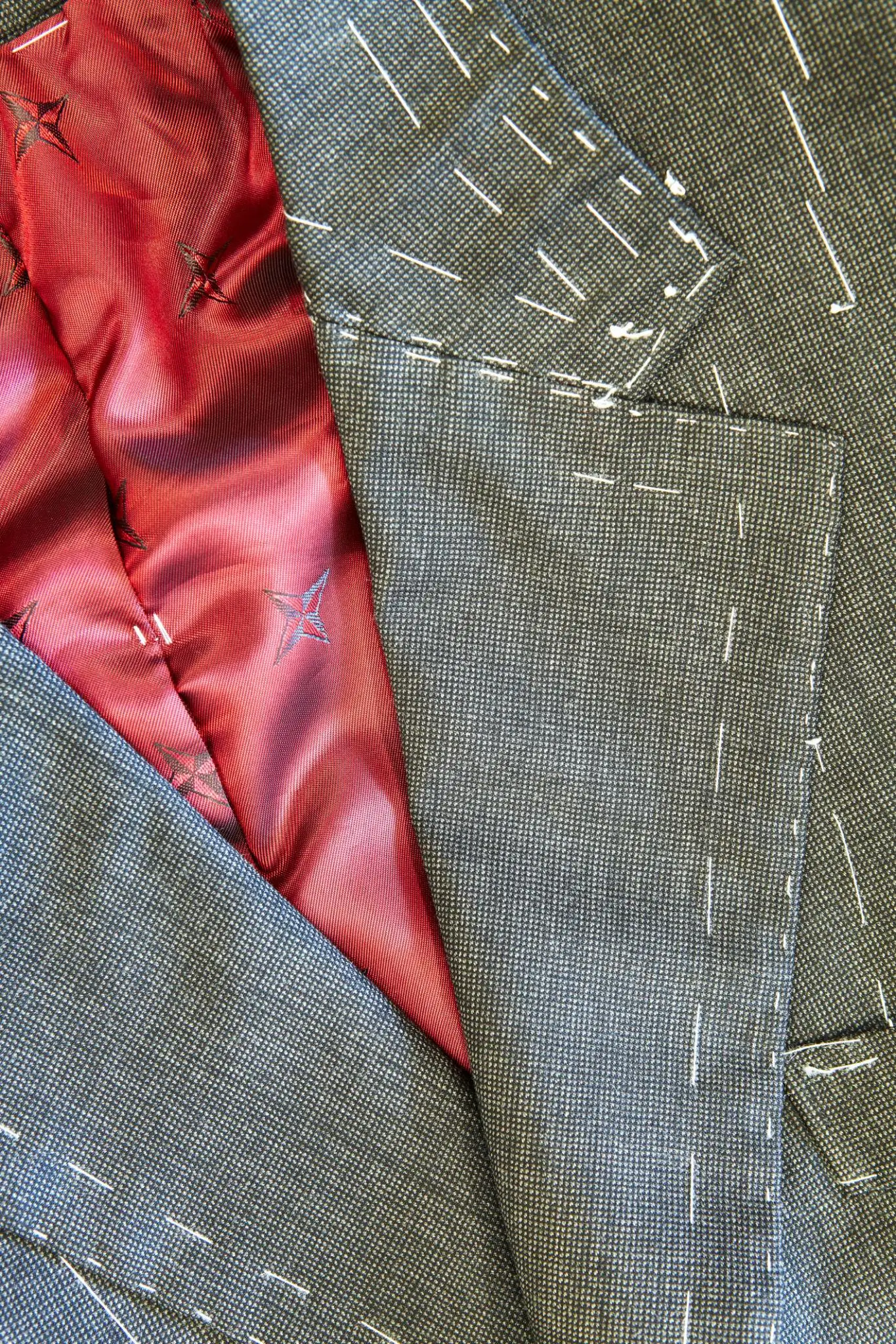 Hand-stitched horsehair canvas provides rigidity. Multiple interfacing layers control drape. Shoulder padding is sculpted rather than simply inserted.