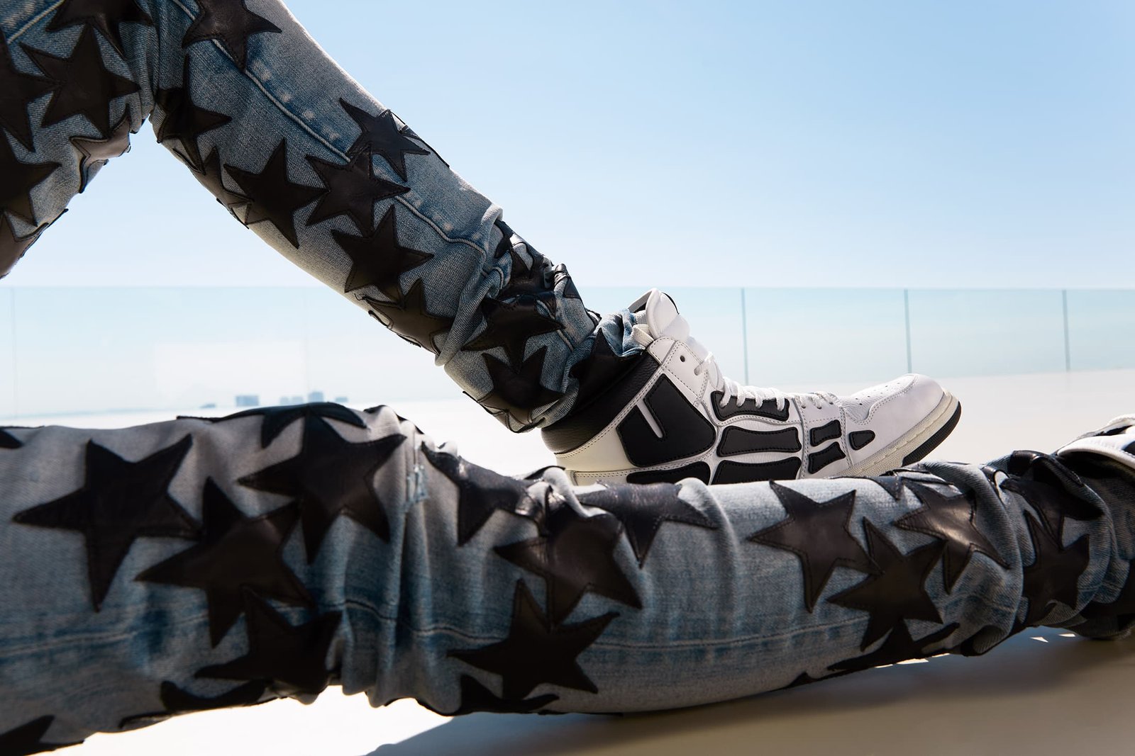 One standout piece from the collection is the Chemist Jean, a skinny-fit denim jean featuring black leather star patches and distressing details. The jeans combine AMIRI’s signature rock ‘n’ roll aesthetic with Chemist’s scientific influences, creating a striking and versatile piece that is sure to turn heads.