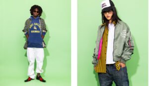 - MA-1 Bomber Jacket: This jacket presents a pixelated burning car screen-printed across the back, complemented by a custom key fob on the flight pocket and a mini backpack, highlighting the collection’s focus on multi-pocket utility.
