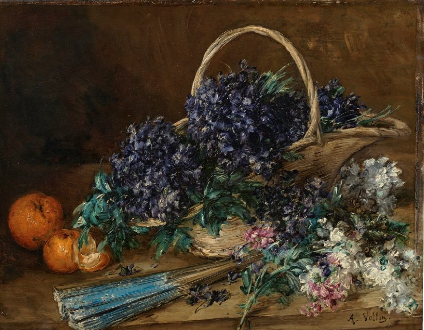 In A Basket of Flowers, Oranges and a Fan on a Table, Vollon performs alchemy. He transmutes the everyday into the eternal, not through grandiose gesture but through meticulous care. He tells no story, and yet an entire world unfolds. His signature—“A. Vollon.”—in the lower right is not a vanity mark, but a reverent closing parenthesis to a meditation. A reminder that all things, even beauty, are mortal, and yet in their transience lies their profoundest power.