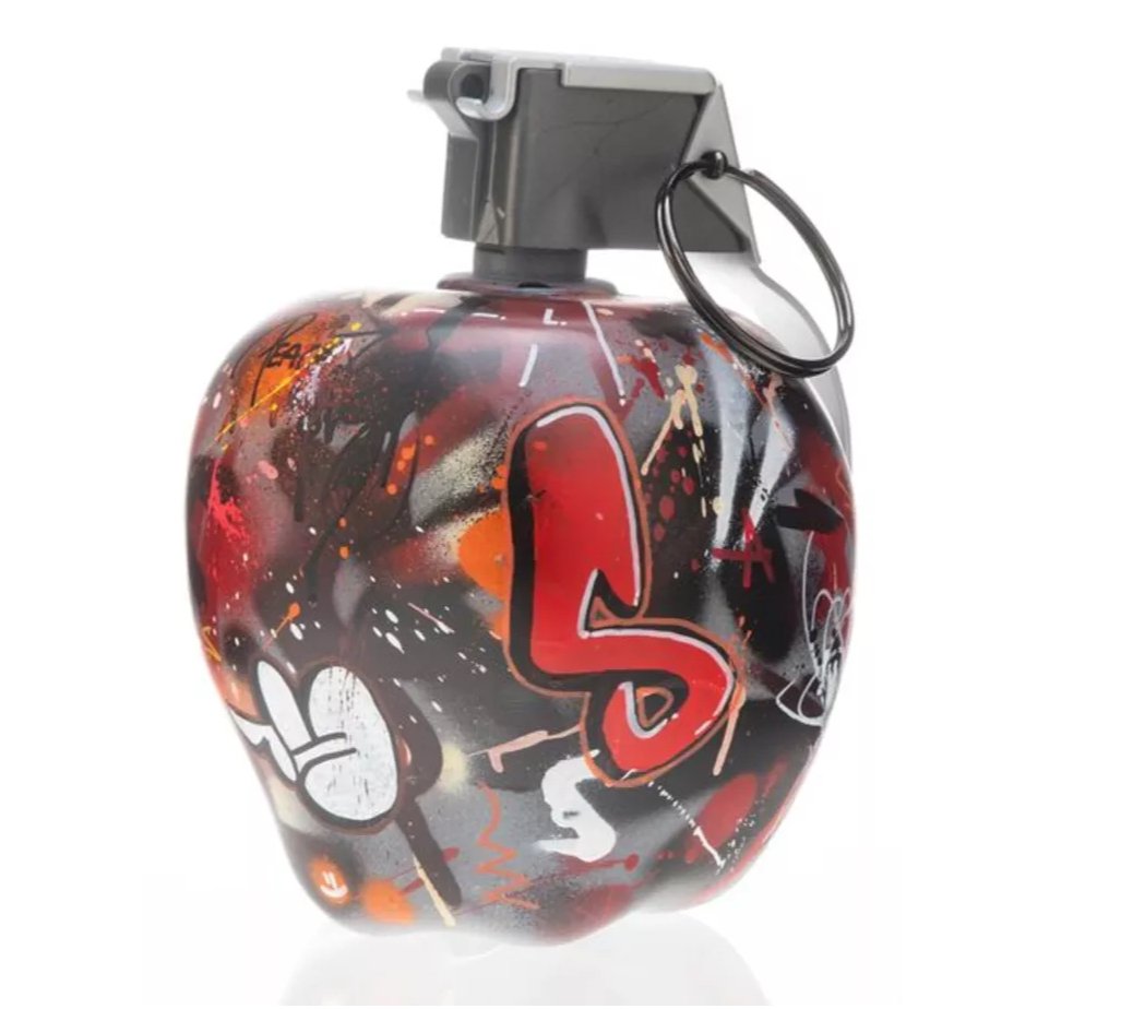The sculpture, crafted from spray paint, ink, metal, and resin, features a stylized apple adorned with graffiti-inspired markings. The clean, minimalistic design of the apple is disrupted by vibrant colors and chaotic graffiti motifs, a signature of Whatson’s style. This juxtaposition mirrors the tension between the polished image of corporate brands and the raw, untamed creativity of street art.