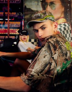 The campaign imagery roots the collection in the environments that inspired it. Shot in arcade locations lit by RGB glows and cabinet screen flickers, the visuals show models leaning into the playfulness, layered in psychedelic graphics and monochrome textures. There’s an energy of movement—even in stillness—as if each image is one frame away from a drum and bass drop or a wipeout on a dirt bike.