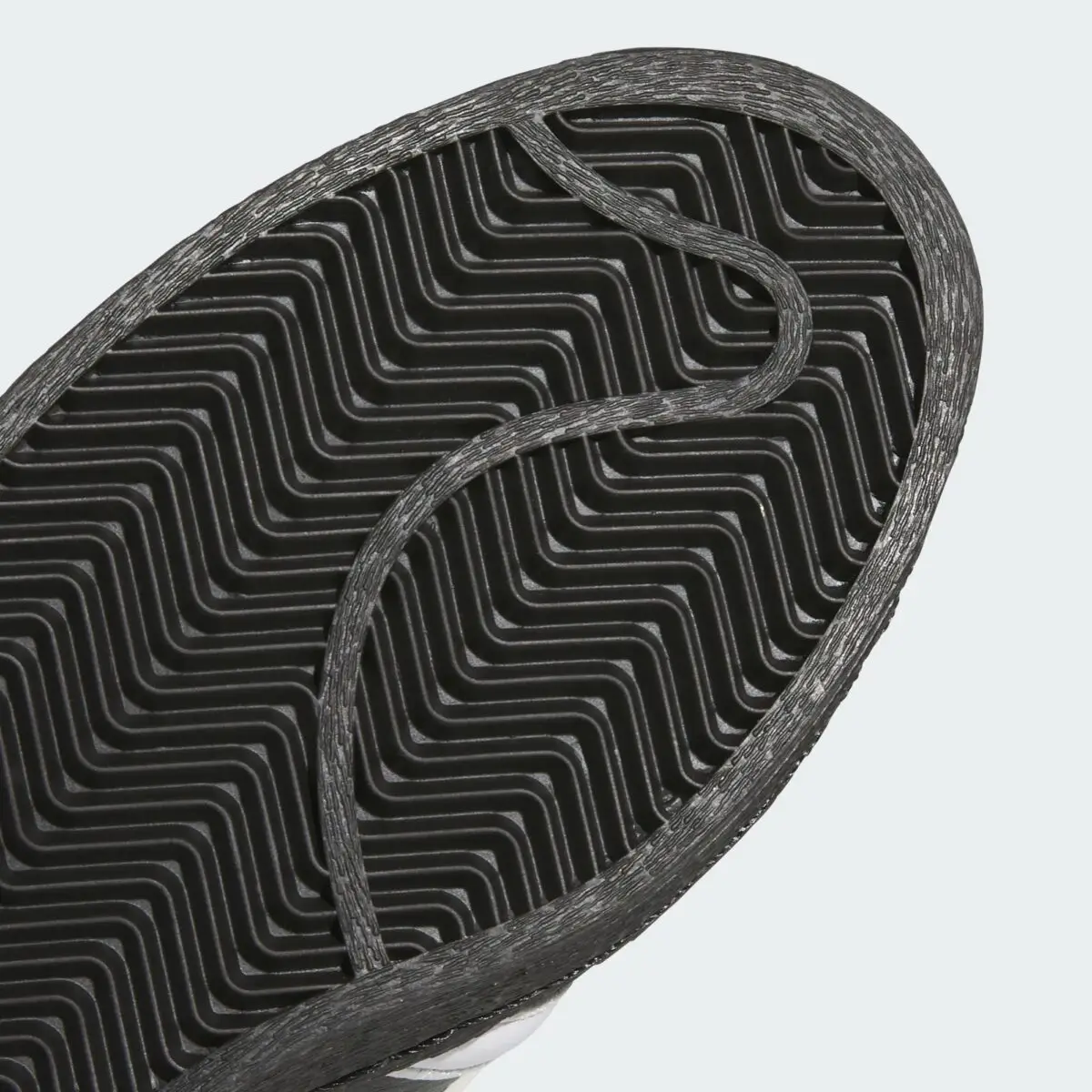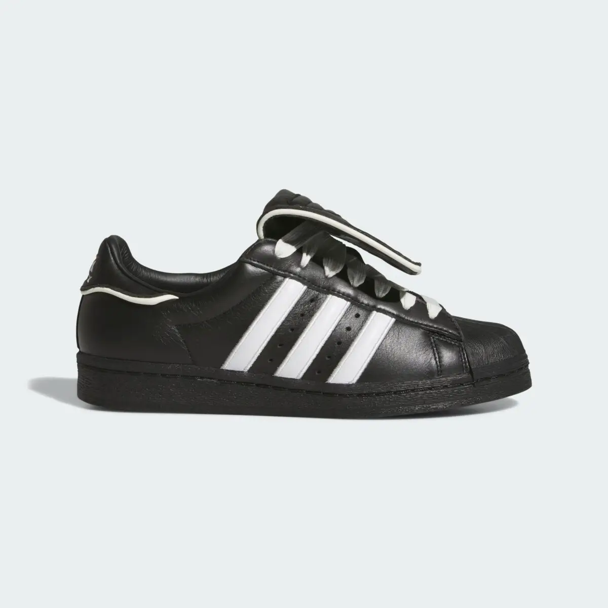 The iconic shell toe remains intact, rendered in crisp white rubber—a visual anchor that connects the shoe to its adidas lineage. The three stripes follow suit, cutting through the black upper with clean precision. Gold foil branding adds a final layer of contrast, subtle yet unmistakable.