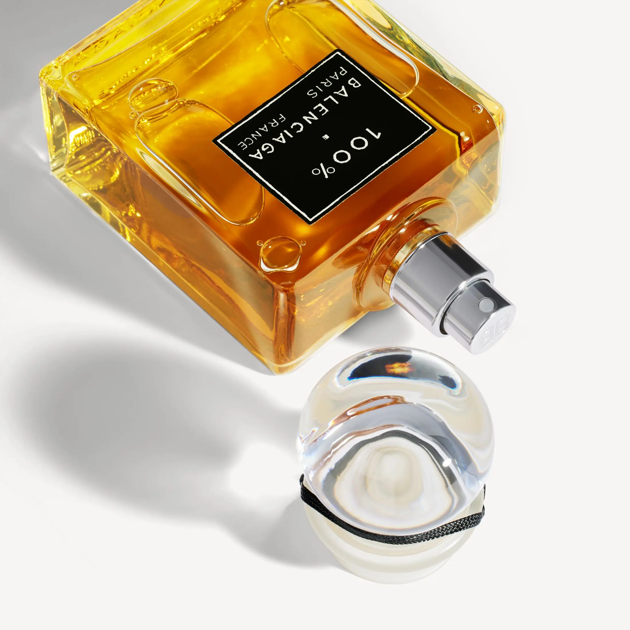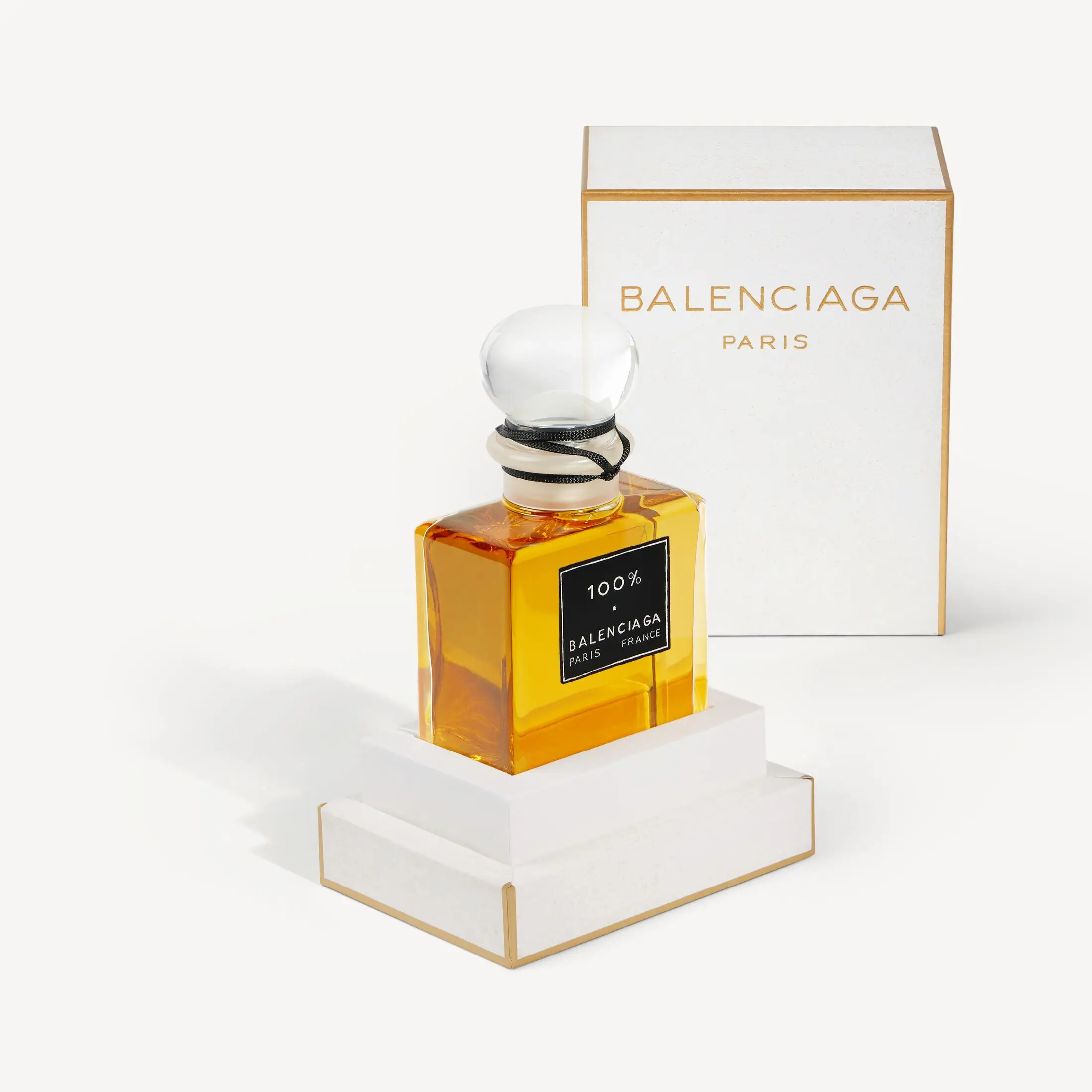 Balenciaga has always treated packaging and presentation with the same seriousness as the product itself. The 100% perfume bottle reflects this design philosophy with striking clarity.
