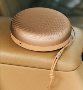 There are no harsh lines, no garish branding. The aluminum grille curves seamlessly into a rubberized base. A leather strap loops from the edge—more than an accent, it’s a utilitarian detail for hanging the speaker on a hook, bike, or backpack. Portability doesn’t compromise elegance. The Beosound A1 looks just as natural on a marble countertop as it does on a beach towel or wooden desk.