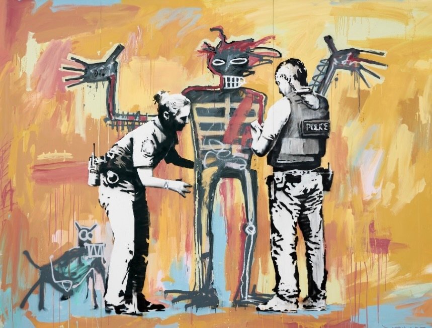 In this collaborative visual universe, Banksy’s painting acts almost as a dialogue with Basquiat beyond the grave. The skeletal figure, in Basquiat’s vocabulary, represents the raw human condition: stripped down, vulnerable, electric with emotion. Here, it is being “searched” by police officers—emblems of institutional scrutiny. The officers’ stenciled precision contrasts starkly with the feverish, impulsive strokes of the Basquiat-inspired figure. The juxtaposition suggests a violent clash between the free spirit of artistic expression and the cold apparatus of state control.