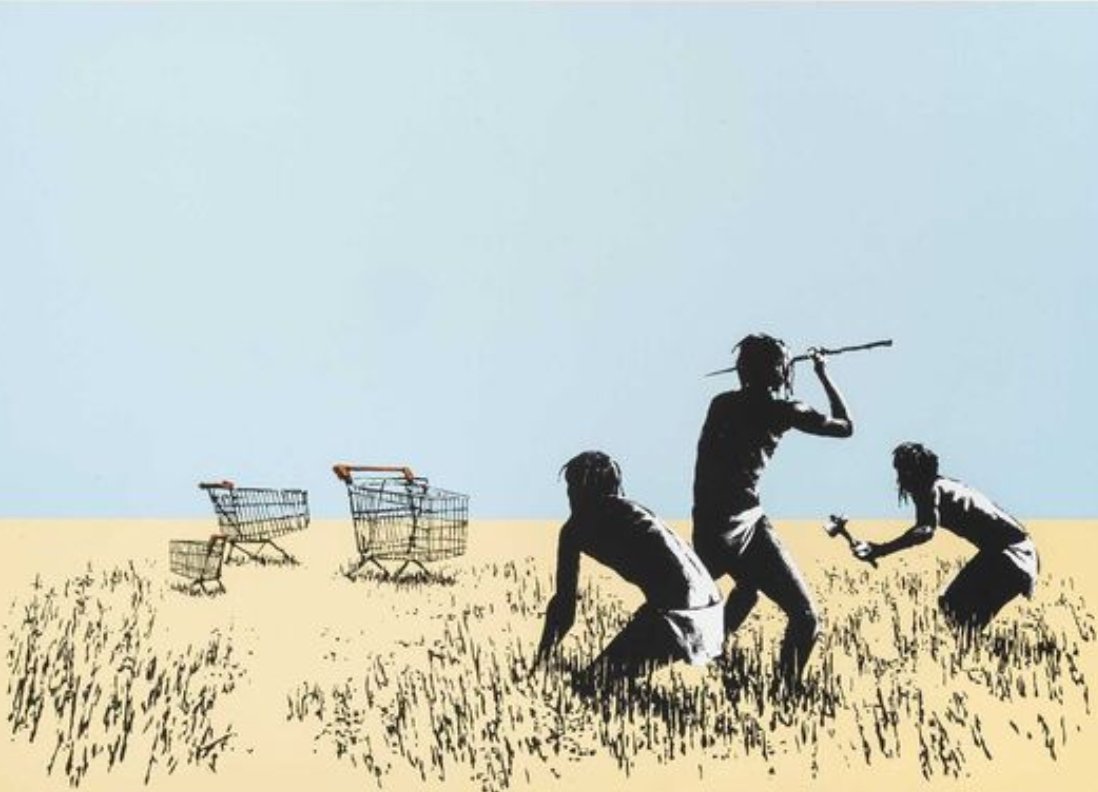 Banksy’s use of irony is evident in the depiction of hunter-gatherers, who traditionally hunted for survival, now hunting shopping carts. This absurd scenario satirizes the modern pursuit of material wealth, suggesting that society has replaced genuine needs with superficial desires. The humor in the piece serves to engage viewers, prompting them to reflect on their own consumption habits.