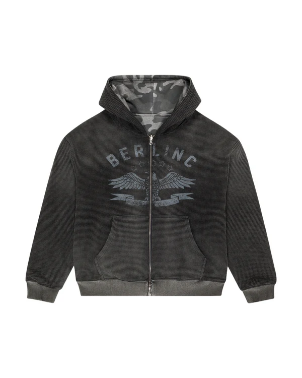 The reversible camo zip-up hoodie by BERLINC operates within a category that has shifted from utilitarian anonymity into a site of deliberate design expression. Once tied to military surplus and outdoor functionality, camouflage has been recontextualized through decades of streetwear adoption, where it now functions less as concealment and more as a visual code—one that signals adaptability, identity, and urban awareness. BERLINC’s interpretation leans into this transformation, using reversibility not as novelty, but as structure.