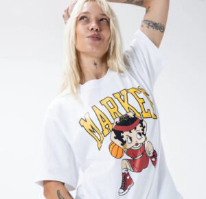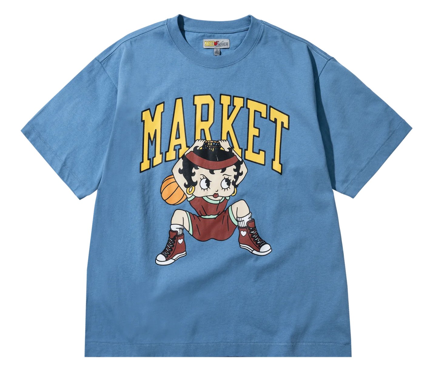 The centerpiece of this t-shirt is a dynamic screen-printed graphic of Betty Boop executing a basketball dunk. This portrayal reimagines the 1930s cartoon diva in an athletic context, blending nostalgia with a modern twist. The design is further accentuated by the collegiate-style “MARKET” logo emblazoned above Betty, rendered in bold yellow with a black outline, adding a varsity flair to the overall aesthetic.