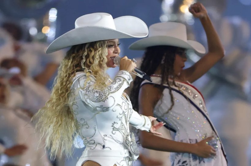 The energy shifted dramatically as Beyoncé launched into her viral hit “Texas Hold ’Em.” With a dazzling line-dance sequence behind her, she turned the massive stadium into a neon-lit honky-tonk, complete with flashing signs and mechanical bulls.