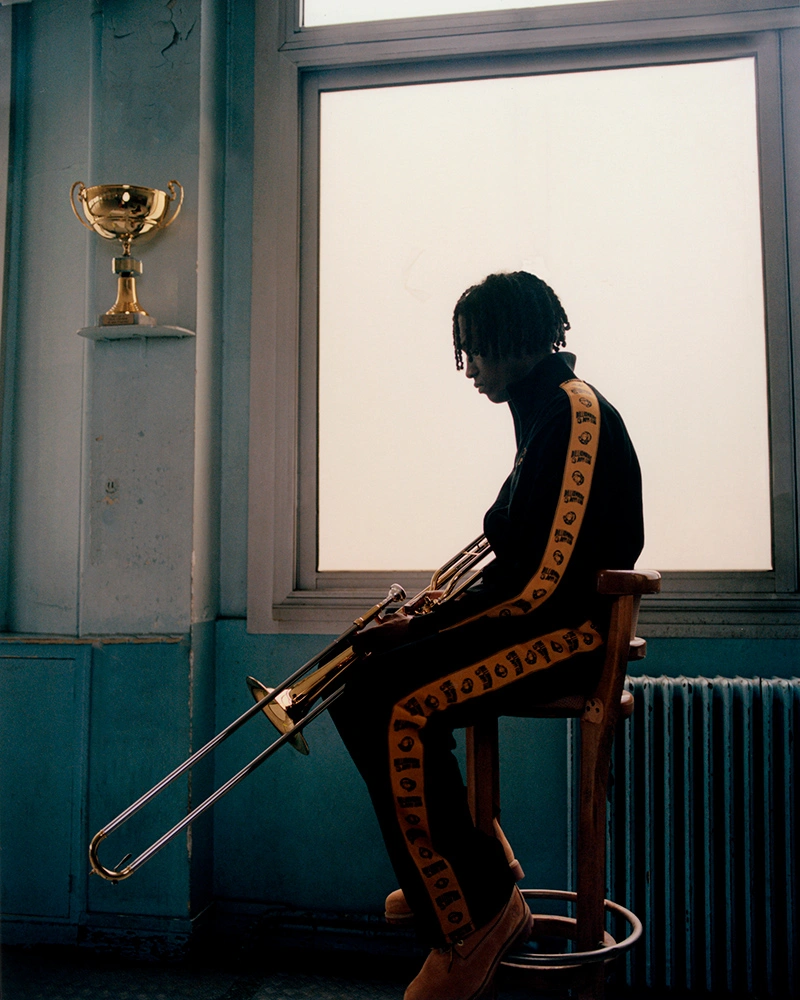 In the campaign imagery, models stand in abandoned gymnasiums and roadside fields, surrounded by marching drums, camouflage banners, and hand-painted murals. It’s a world where tradition meets imagination, where sports uniforms morph into street uniforms—a literal parade of identity.