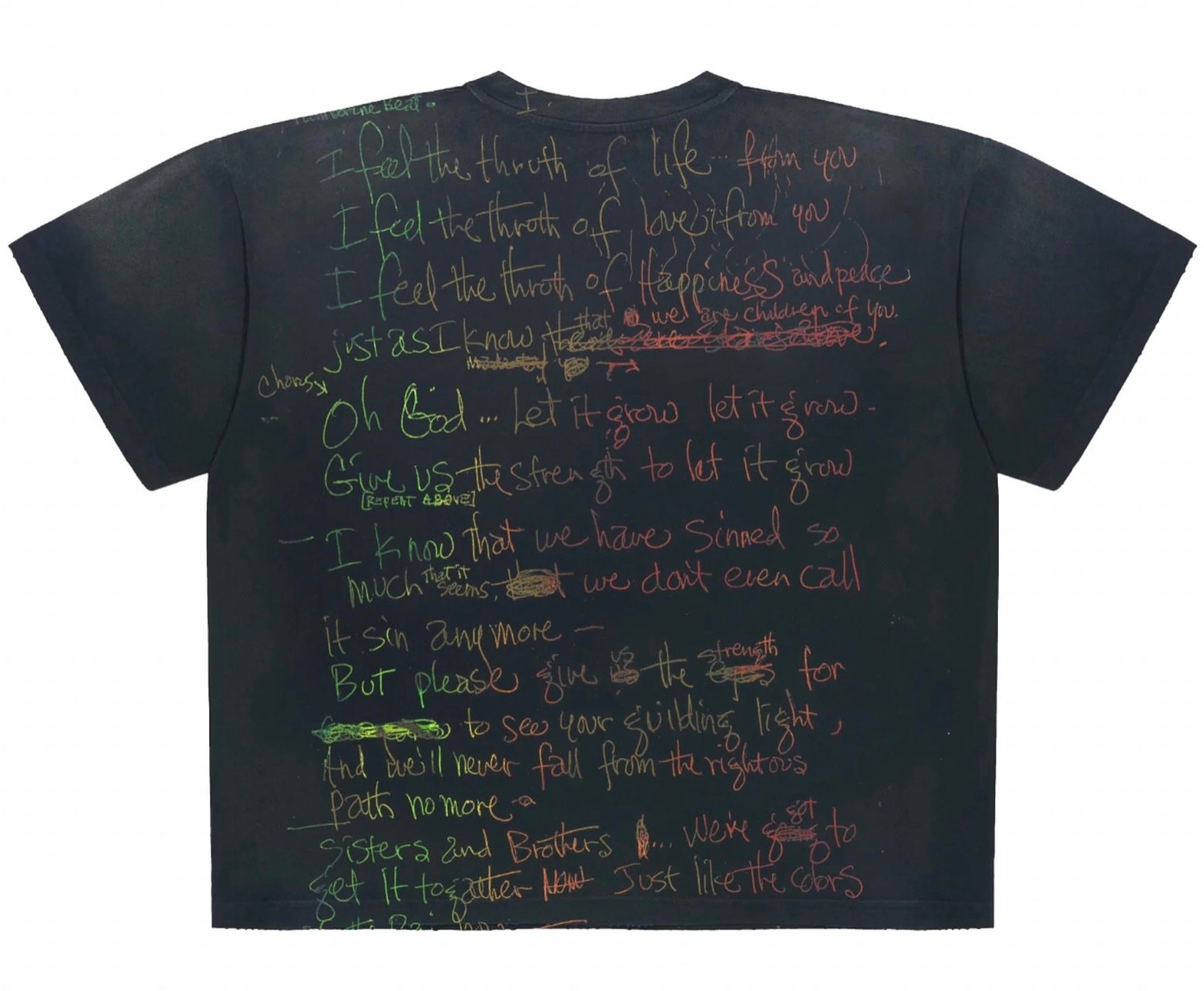 The back of the tee deepens this archive-like quality. Here, Hendrix’s handwritten lyrics are transcribed in multicolored chalk-like scrawls, layered and imperfect, as though pulled directly from a notebook page. Phrases such as “I feel the throth of life from you” and “Oh God … let it grow” echo his constant exploration of spirituality, love, and transformation. There is rawness in the handwriting: words are crossed out, edited, doubled back on—an insight into Hendrix’s process. The wearer is invited into that intimate space of creation, where even hesitation becomes poetry. This handwritten quality grounds the tee in authenticity, a reminder that great art often begins as fragile drafts scribbled in ink and pencil.