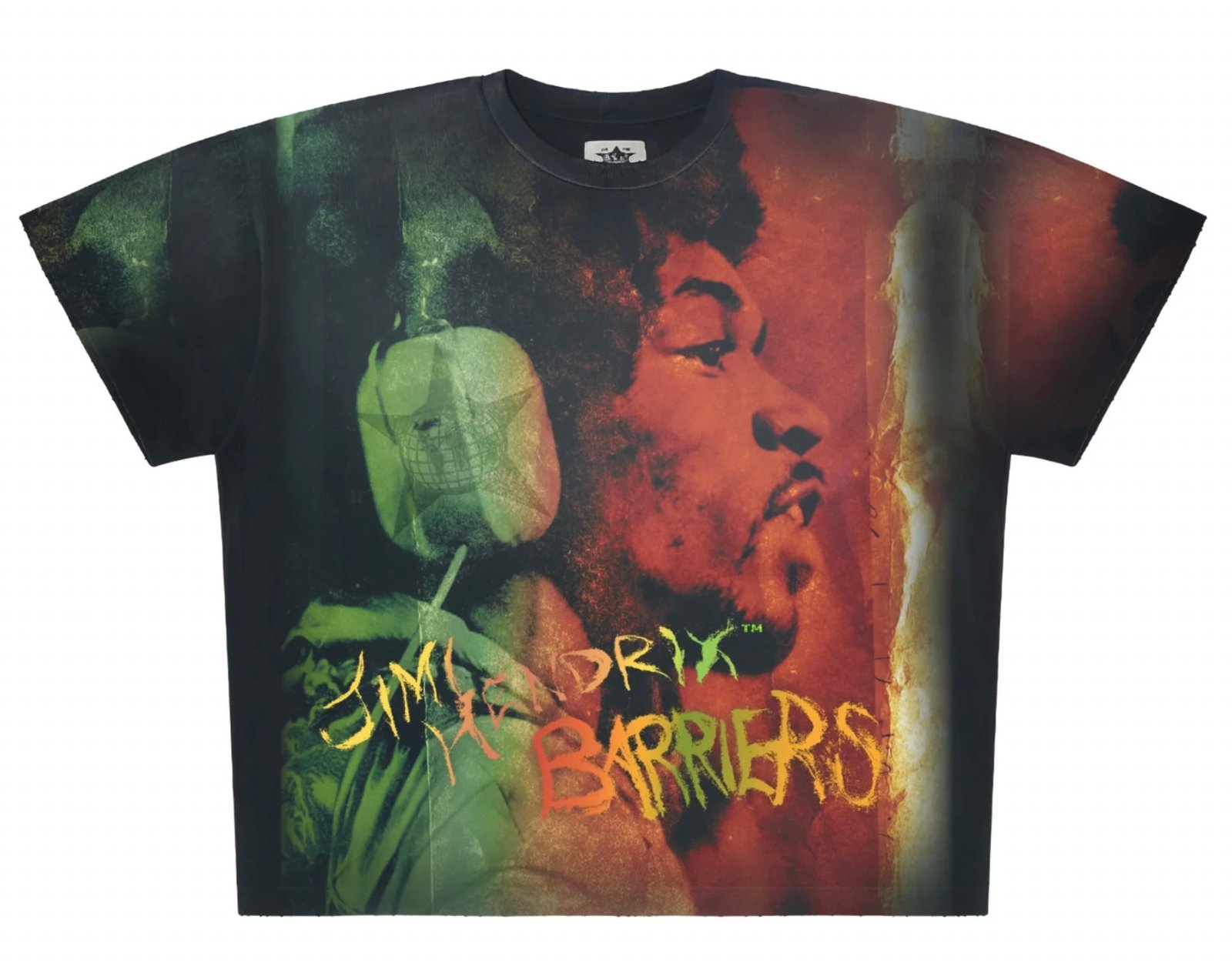 On the front, the design places Hendrix in the recording studio, headphones on, mid-expression, immersed in the act of creation. The portrait is overlaid with rich, saturated tones of green, red, and amber—colors that nod to countercultural aesthetics of the late 1960s, blending psychedelic undertones with Rastafarian energy. Across the image, “Jimi Hendrix” appears in a graffiti-like script, followed by the word “Barriers,” an intentional reference to breaking conventions both musically and socially. It’s not simply a name drop—it’s a declaration of Hendrix’s ethos, his drive to dismantle artistic and cultural boundaries through sound and spirit.