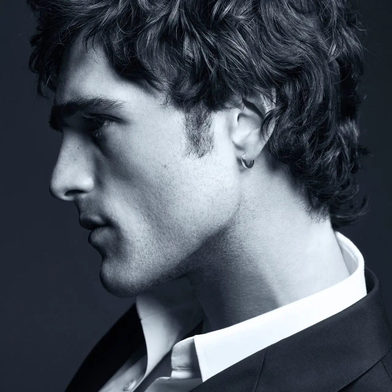 Shot in monochrome with faint blue undertones, it avoids spectacle. Elordi stands within a corridor — framed, observed, unmoving. The camera circles, but he remains centered. Anchored.