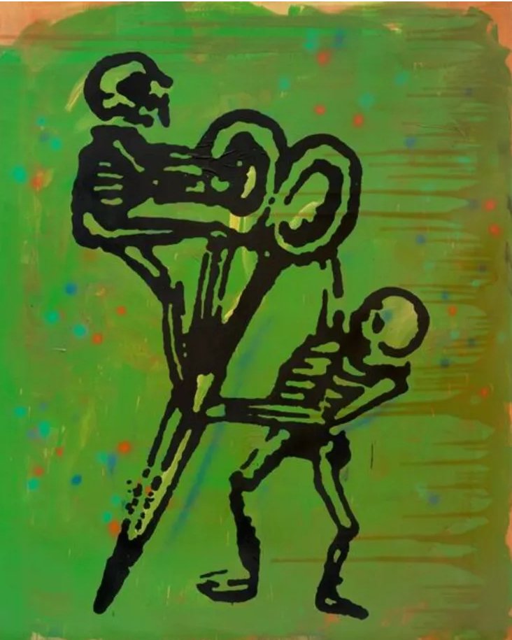 The interplay between these two techniques creates a dynamic tension within the composition. The acrylic paint provides a textured, tactile surface, while the silkscreened elements introduce a flatness that contrasts with the painterly gestures. This juxtaposition of depth and flatness invites viewers to consider the relationship between the hand-made and the mechanically reproduced, a theme that has been central to much of Dahn’s work.