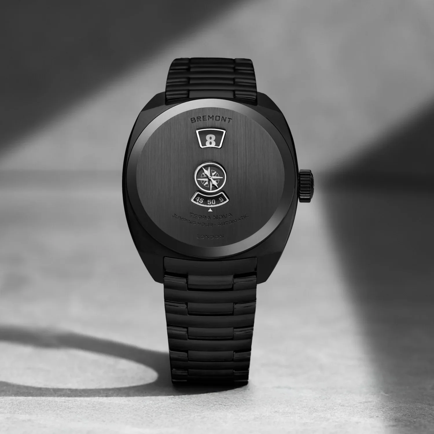 The Bremont Terra Nova Jumping Hour Stealth Black demonstrates how traditional watchmaking complications can be reinterpreted through modern design.