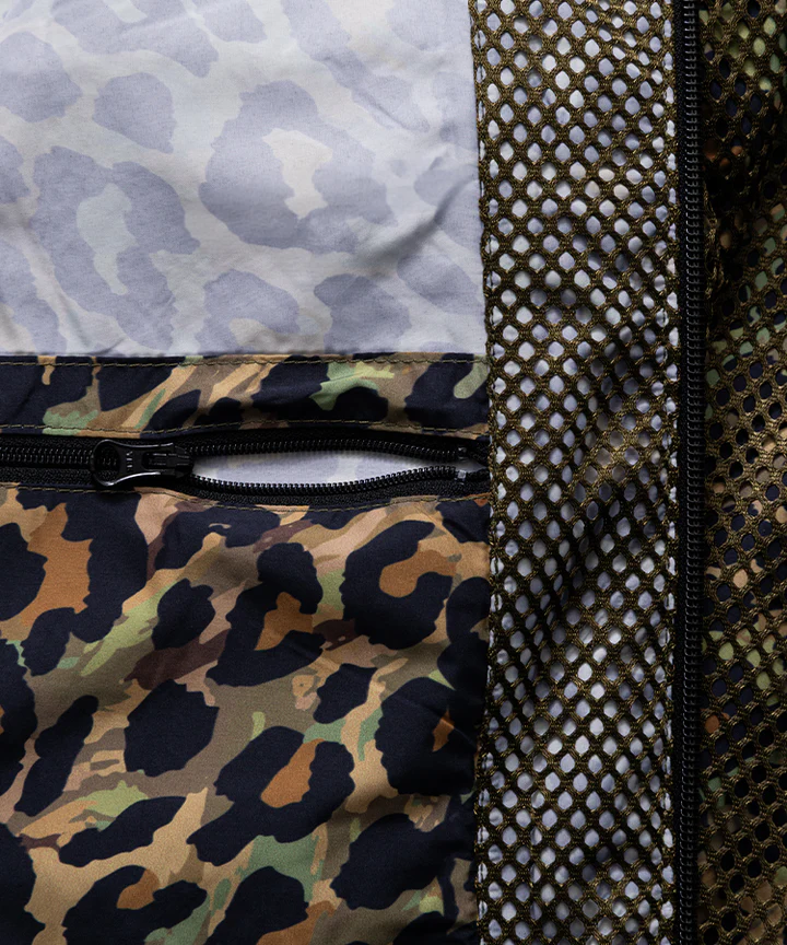 Brigade places the print underneath a mesh layer—olive-toned, slightly lifted, just enough to interrupt the surface. The pattern is still there, still recognizable, but it doesn’t hit all at once. It breaks apart. It comes in pieces.