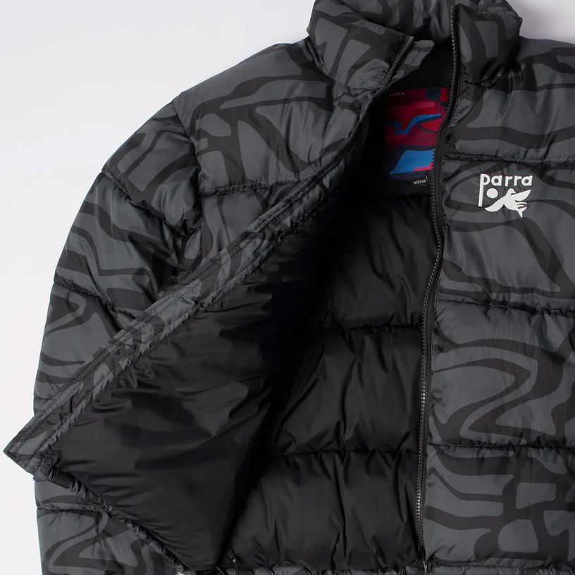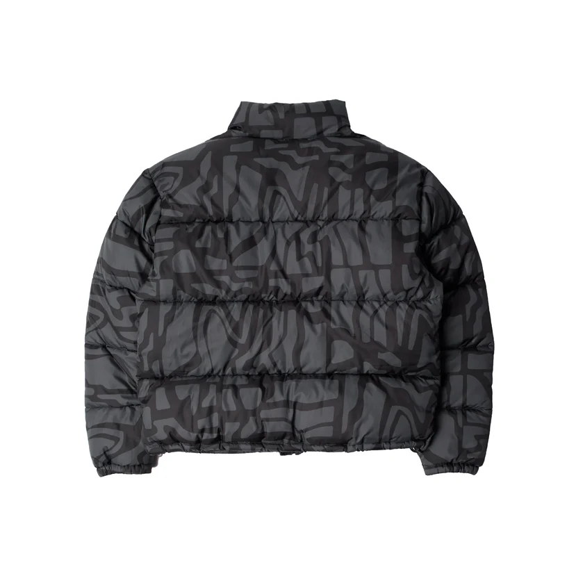 At first glance, the jacket reads as a dark, quietly chaotic field of black, charcoal, and smoke-toned patterns. The closer you get, the clearer its fragmented, maze-like structure becomes. Parra’s Broken FTP print does not mimic camouflage or any familiar streetwear motif. Instead, it feels like an organic topographical map drawn freehand, with thick, sweeping contours layered across the entire garment. It wraps around the sleeves, the front body, and the back without interruption, creating a sense of movement that shifts with each fold of the puffer’s insulated channels.