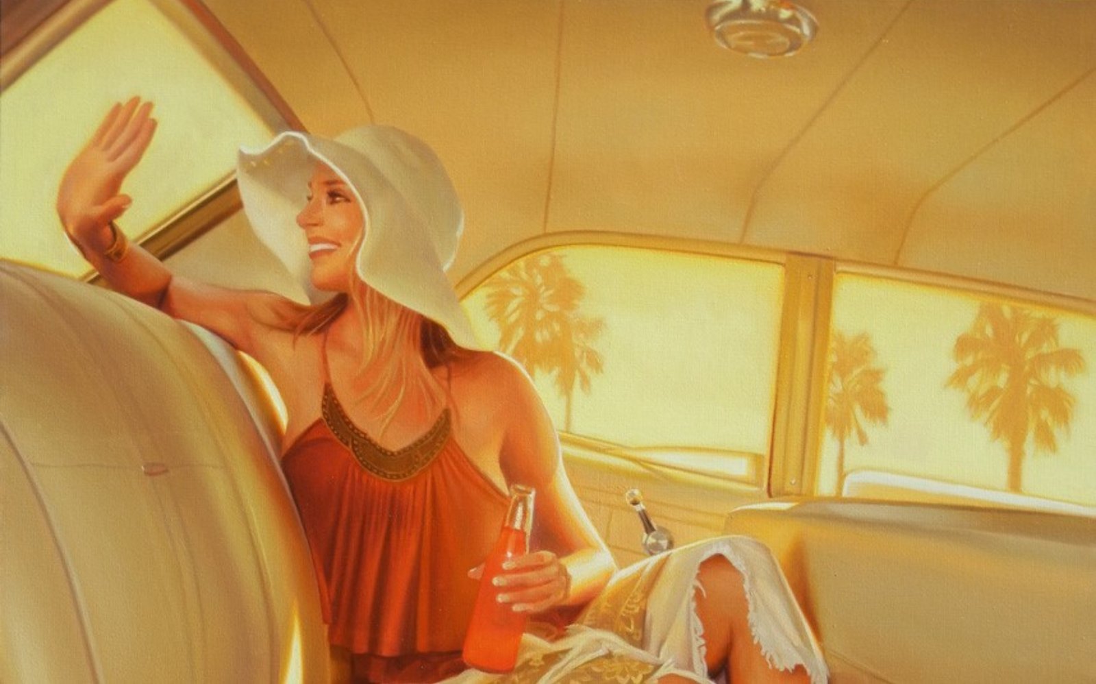 The realism in the rendering is deliberate. Photographic almost, but with painterly precision that stops short of hyperrealism. This allows her subjects to feel both immediate and symbolic. You can believe this woman exists—maybe you saw her once, from across a street, or caught a similar moment in a passing car mirror. But she also stands in for something else: the female muse in American pop imagery, the California dream girl, the eternal question mark in the middle of someone else’s narrative.